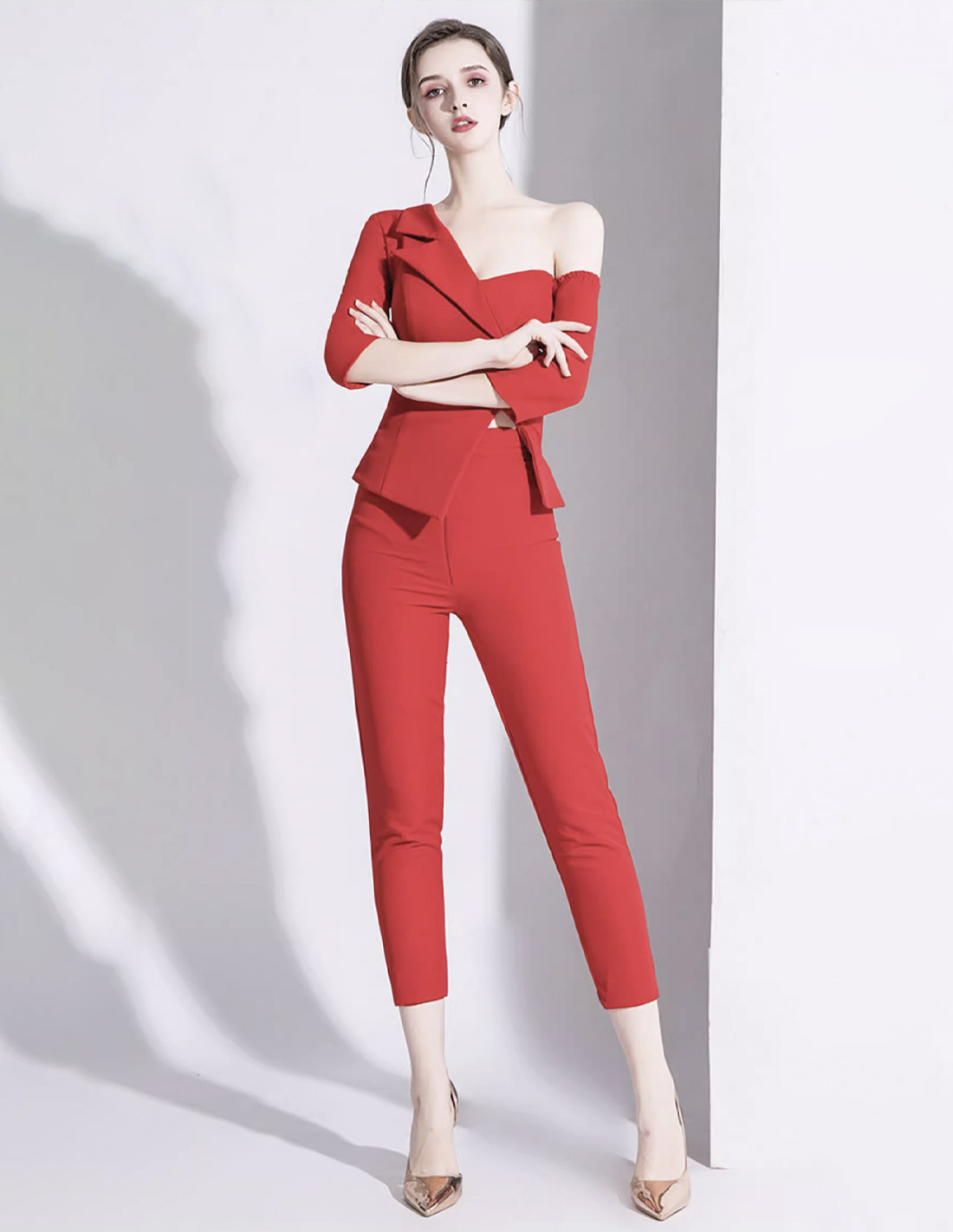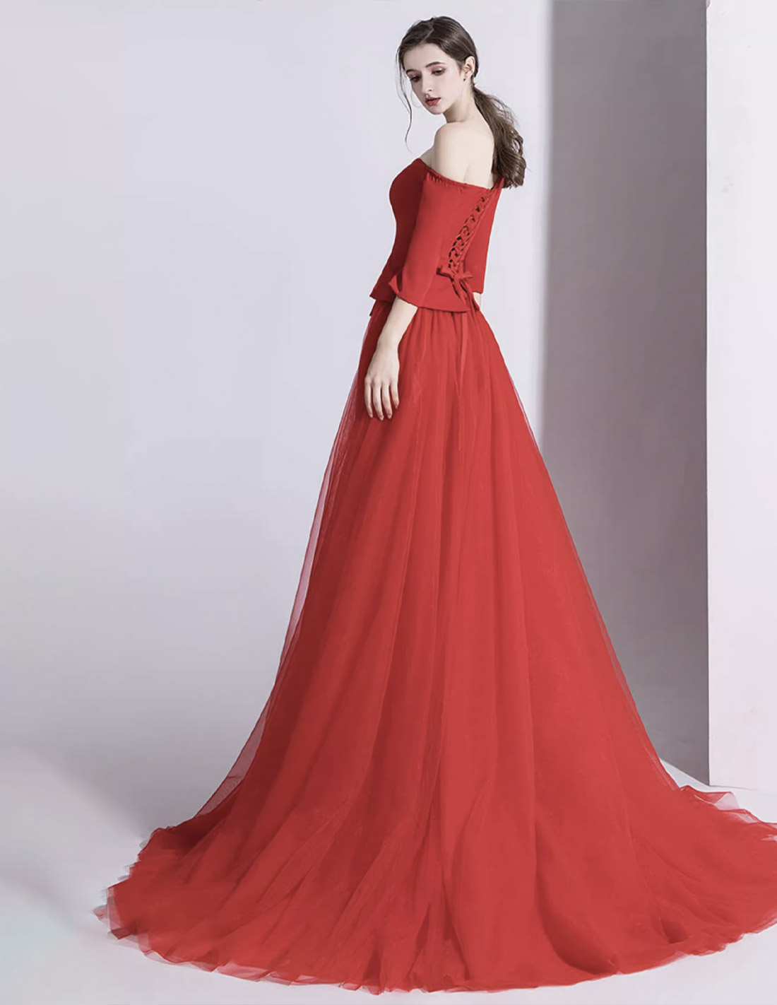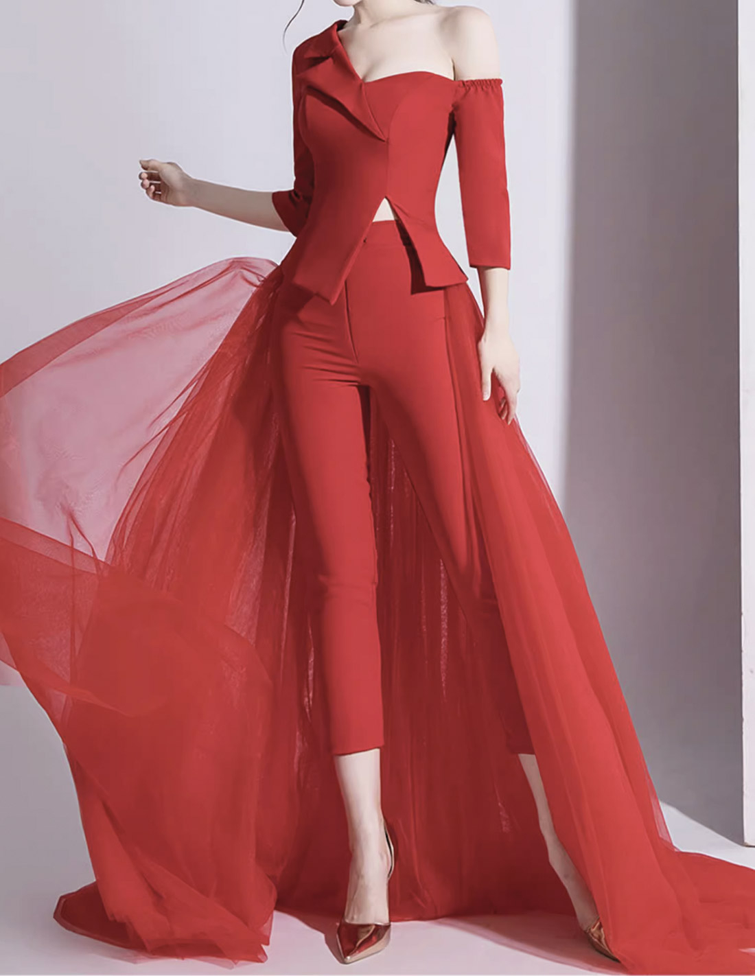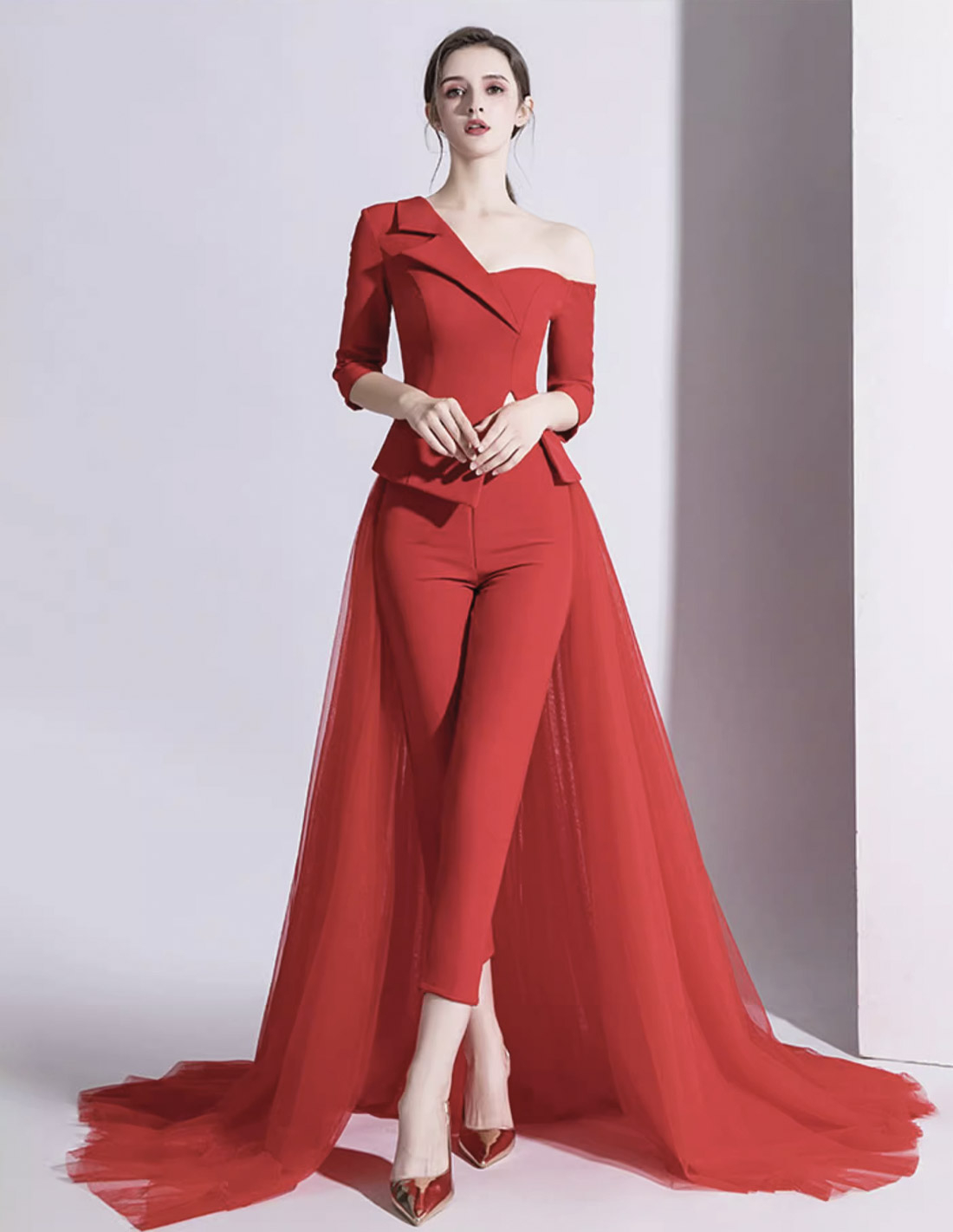 イタリアンサテン チュール オーバースカート ミディアムスリーブ 2way ウェディング パーティ 演奏会 レッド パンツドレス