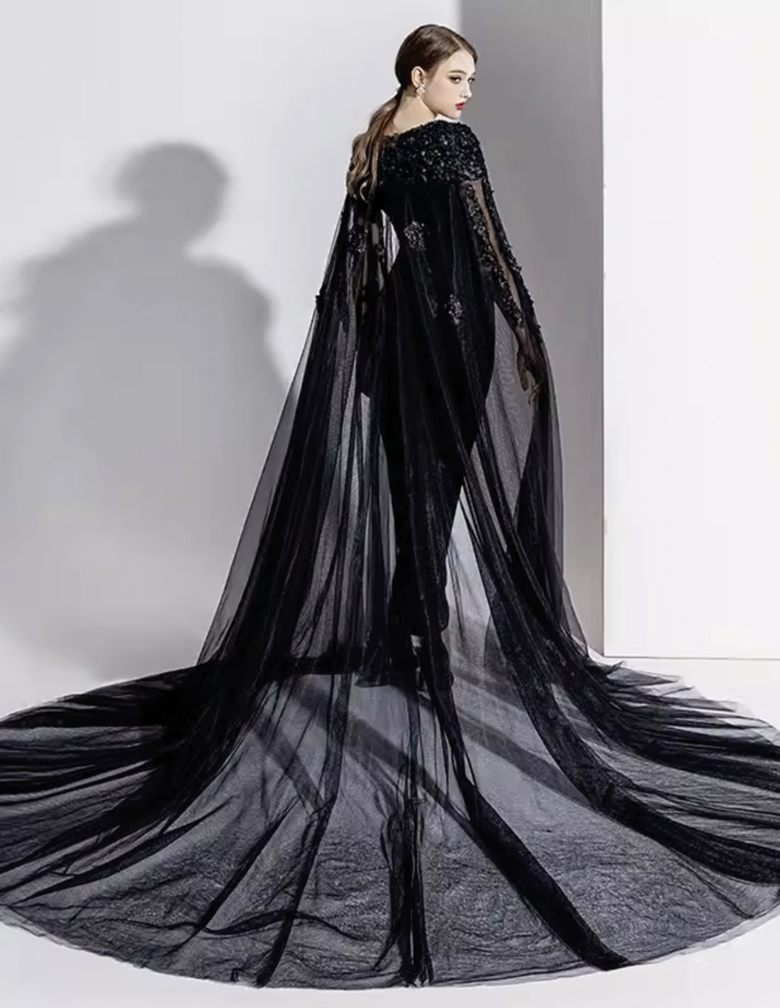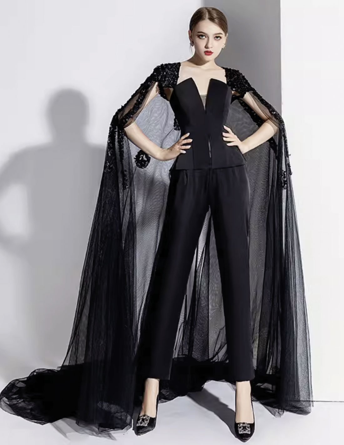 デザイン性の高いブラックのパンツドレスです。肌触りの良いソフトチュールを使用したロングマントは肩にあるレースの部分で簡単に取り外しをすることができます。コルセットはしっかりと体を引き締められるように背中部分がレースアップになっております。パンツのシルエットはフォーマルなストレートで、綺麗に脚のラインを演出してくれます。他人とは違う自分らしさを出したい時に是非こちらのシックなパンツドレスをご着用ください。ウェディングやその他各種パーティでご利用いただけるデザインとなっております。