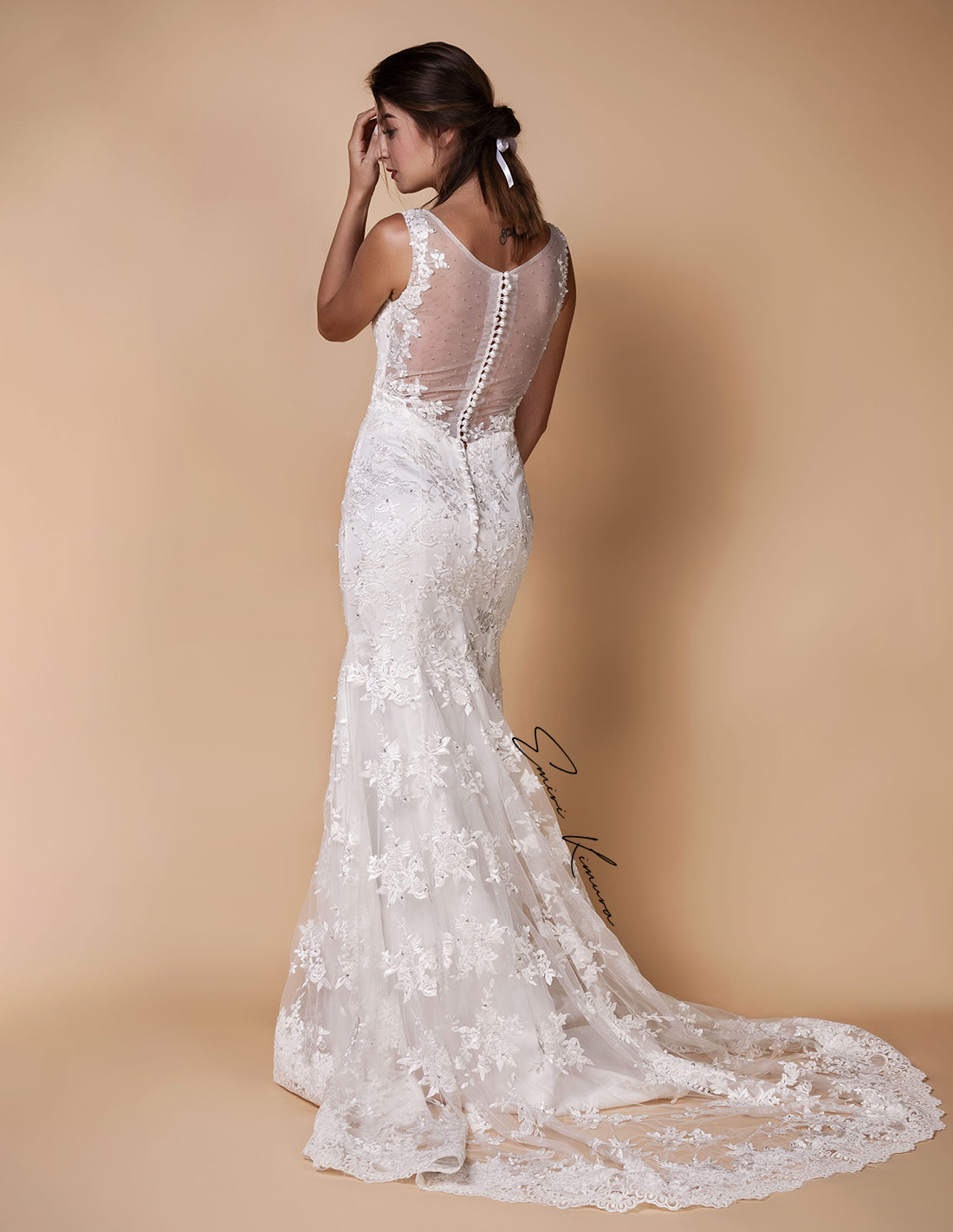 Vネック パールボタン マーメイドライン レース チュール ウェディングドレス