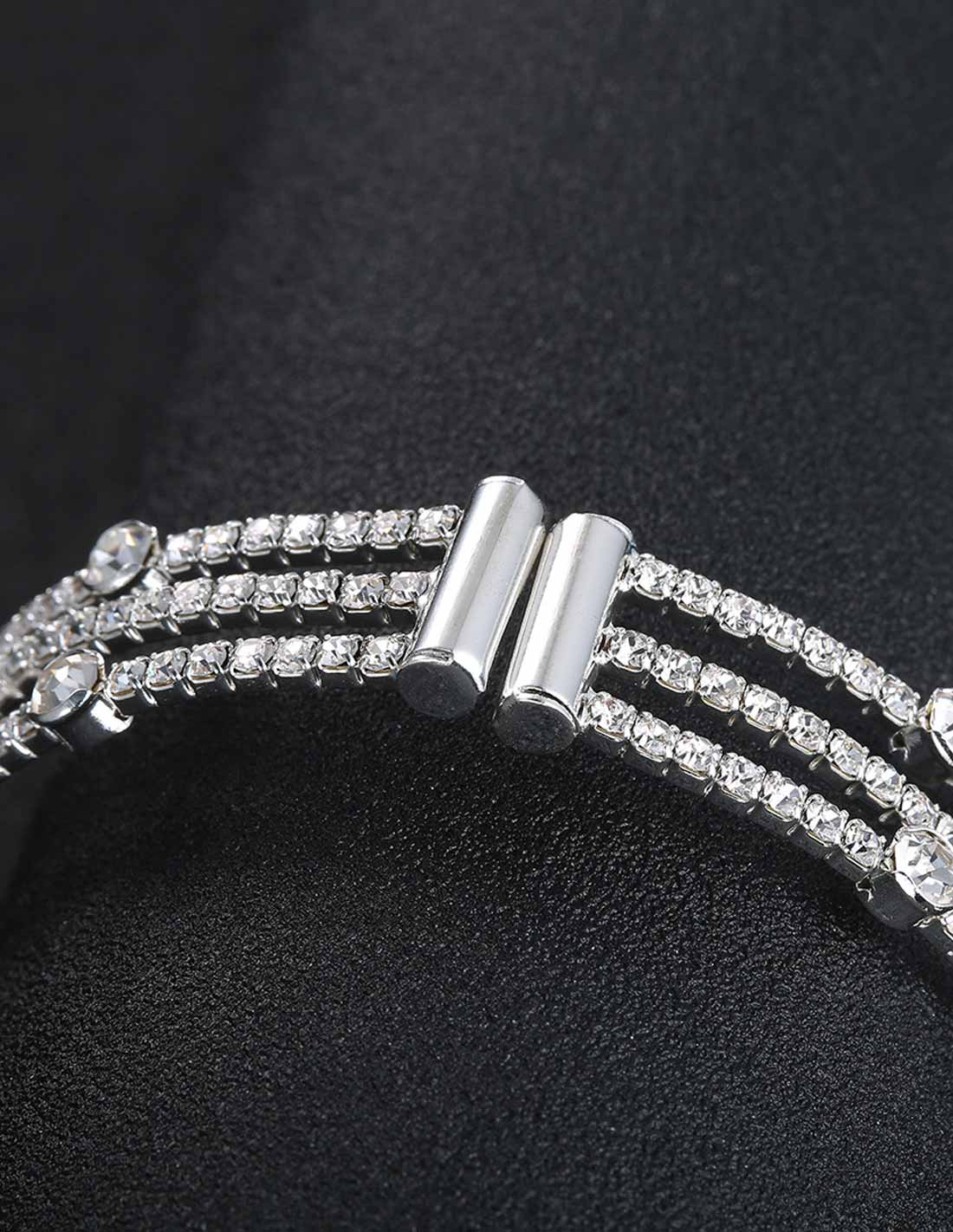 3列に並んだビジューにラインストーンが散りばめられたデザインのブレスレットです。留め具部分はマグネットタイプですので、取り外しが簡単にできます。ブライダル用のみではなくパーティーにも使えるブレスレットです。