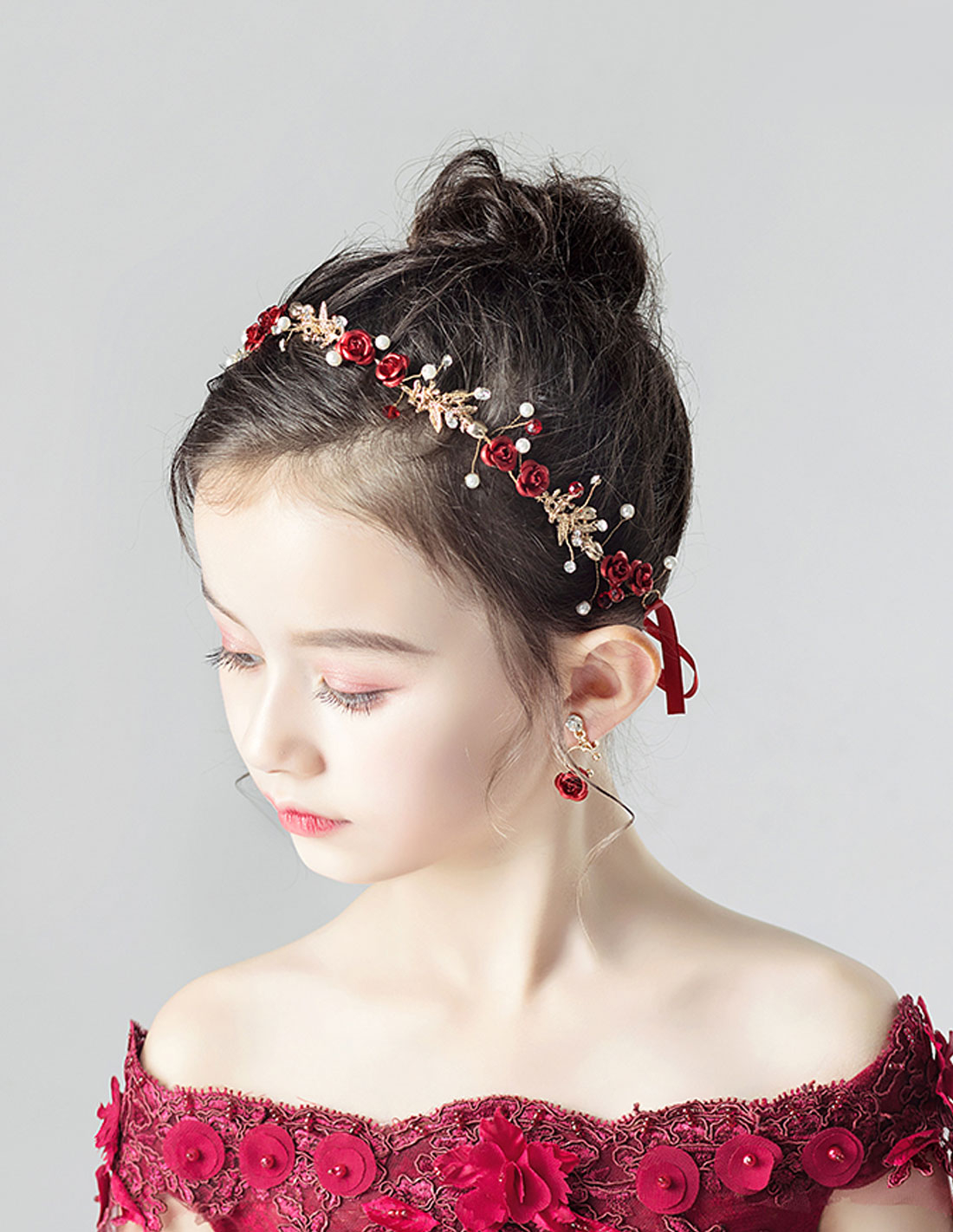 小さなバラが特徴的なリボンで結ぶことの出来るヘッドドレスです。髪飾りにはパールやクリスタル、ゴールドのリーフモチーフが施されています。赤いドレスに合わせてもいいですし、ゴールドやオフホワイトのドレスに合わせることも出来ます。お誕生日会やその他のパーティ用に是非こちらのリボン型の髪飾りをご利用ください。