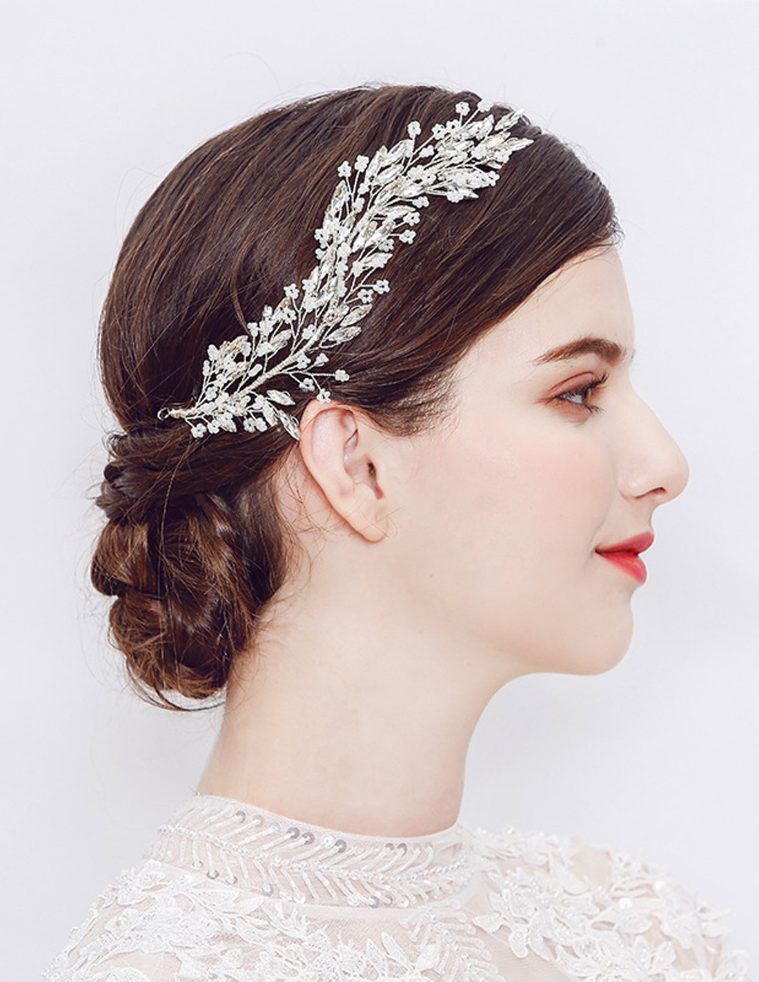大きめなブライダル用ヘッドドレスです。髪を下ろした状態でも、アップした状態でもどちらでもお好みの場所に固定することができるヘッドドレスです。モデルさんのようにサイドに固定することでシンプルなヘアスタイルをすぐに豪華なヘアスタイルにしてくれます。