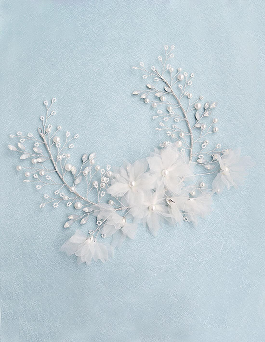 柔らかい生地でできたお花が可愛らしいブライダル用ヘッドドレスです。お花は何層にも生地を重ねて作られていますので、立体感があります。シフォンのシンプルなドレスに合わせてみてはいかがですか?小さなビーズとパールも使用されていますので、華やかなヘアスタイルを作ることが出来ます。
