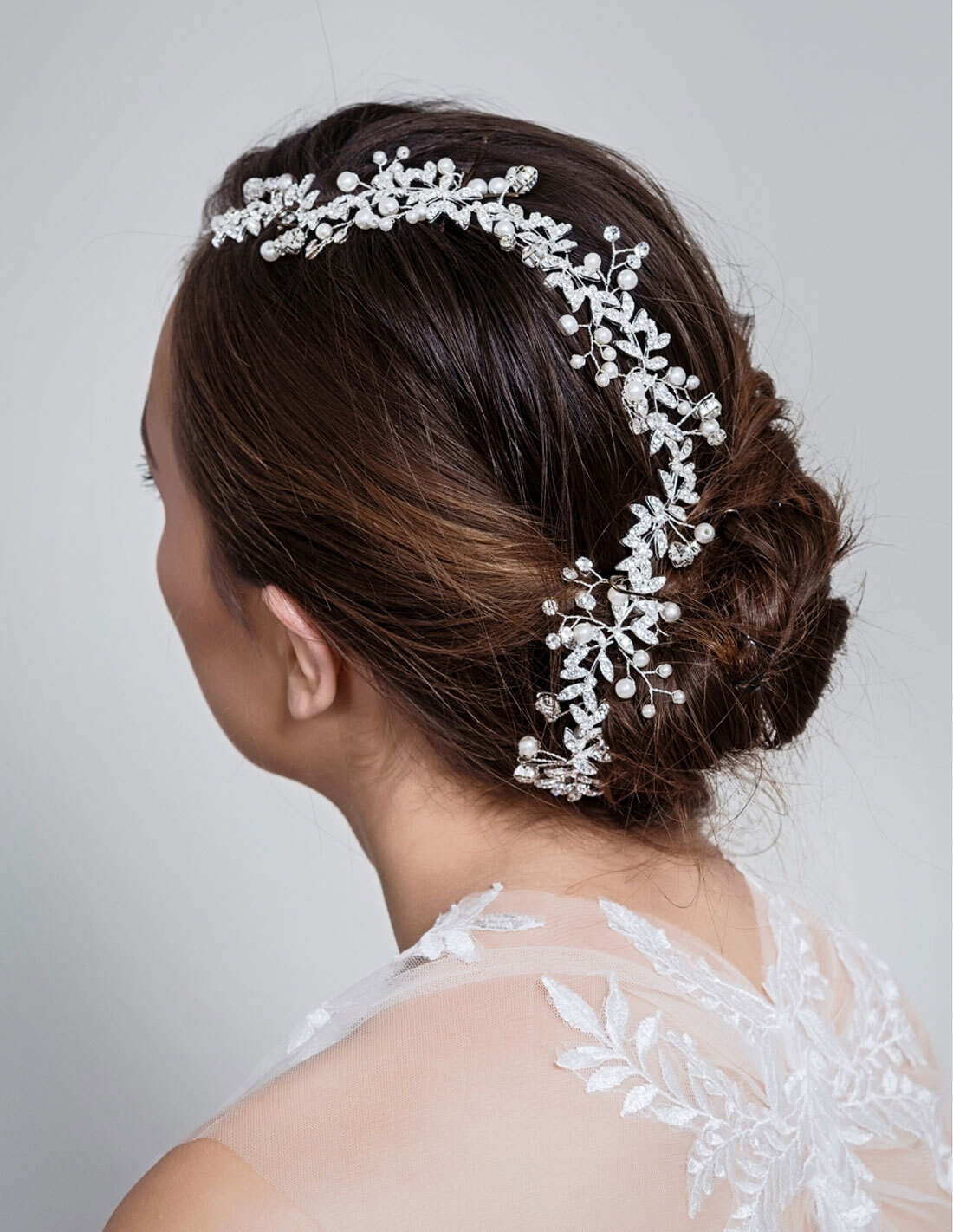 ラインストーンが全体に使用された光り輝くシルバーのブライダル用ヘッドドレスです。モデルさんが使用しているデザインはリボンを取り外してあります。お客様のお手元に届く商品にはオフホワイトのリボンがございますので、花冠のように固定することもできます。キラキラと輝きますので、色々なデザインのドレスと合わせてみてください。