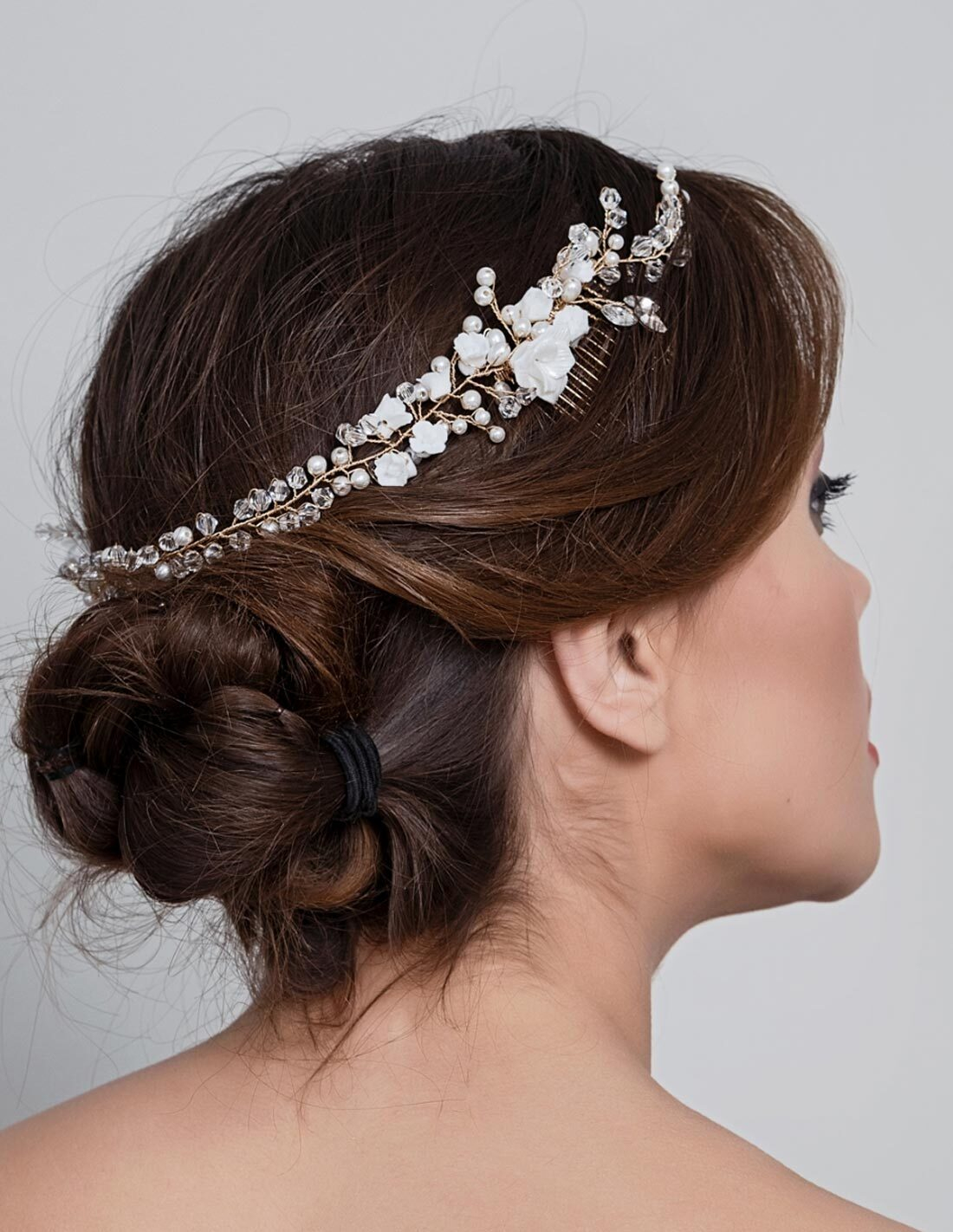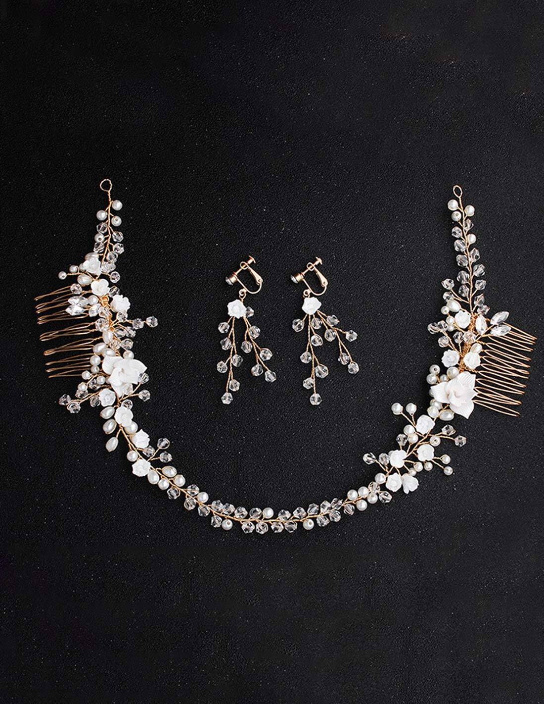 フラワー パール クリスタル ゴールド ブライダル セレモニー イヤリングセット コーム型 ヘッドドレス