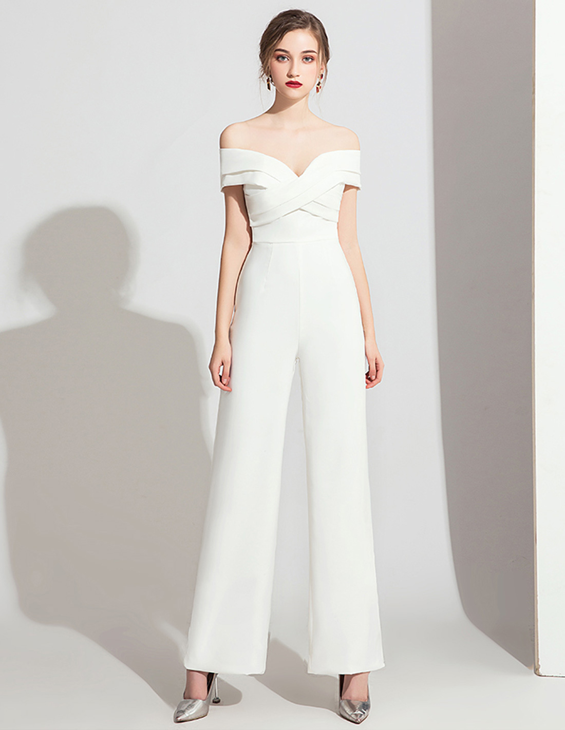 オフショルダーですっきりと首元を見せてくれるシンプルなパンツドレスです。レースなどは一切使用せず、スタイリッシュさを追求した1着となっております。お色直し用や、結婚式の前撮り用としても幅広くご利用いただけるデザインとなっております。