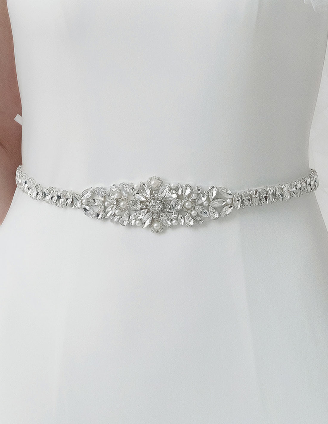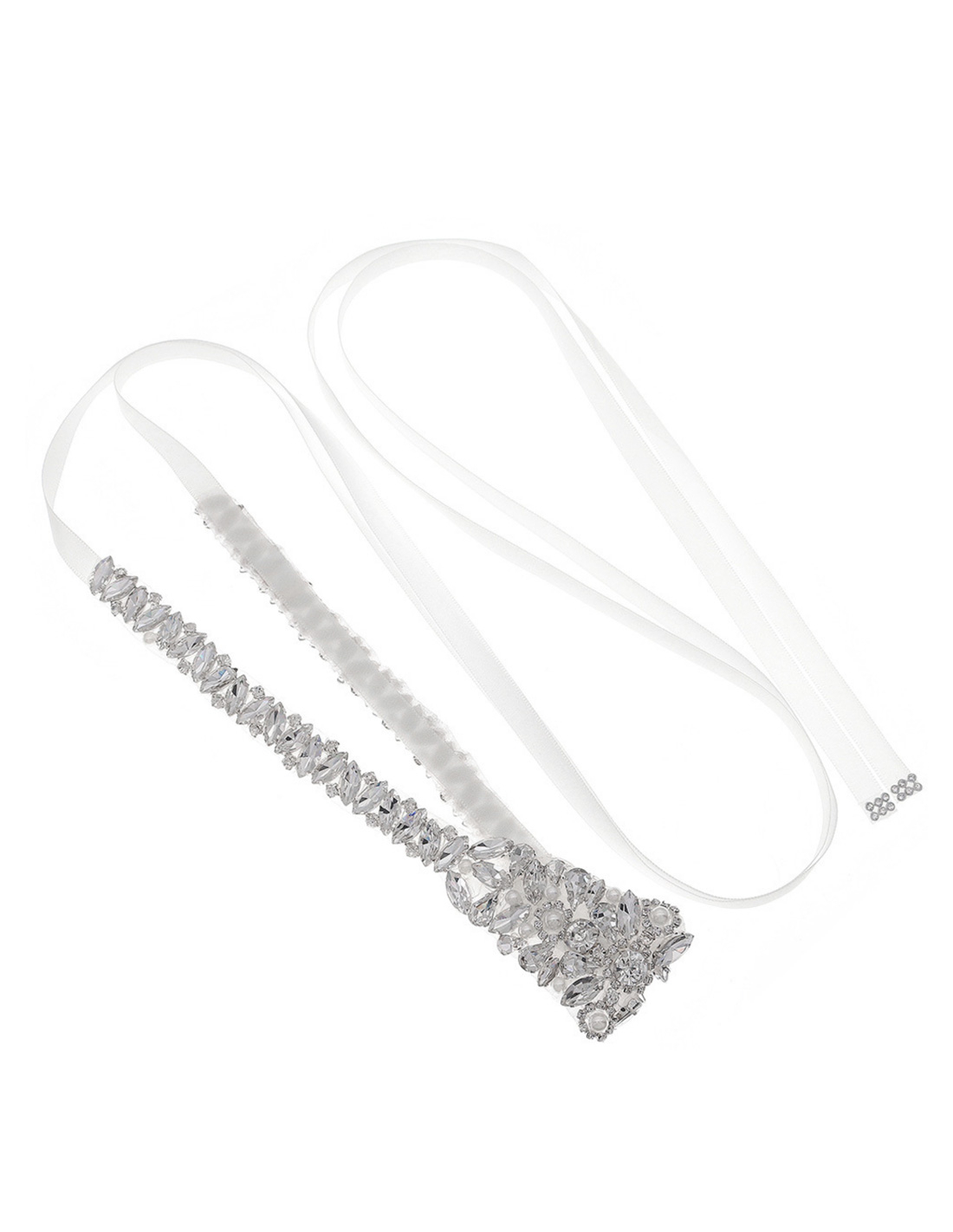 ご自分のドレスを2回楽しんでみませんか?こちらのビジューベルトは細めのデザインで、ちょうどドレスのウエスト部分にフィットするように作られています。リボン結びをしますと、ウエストがきゅっと引き締まりますので、よりドレススタイルをキレイに見せてくれます。