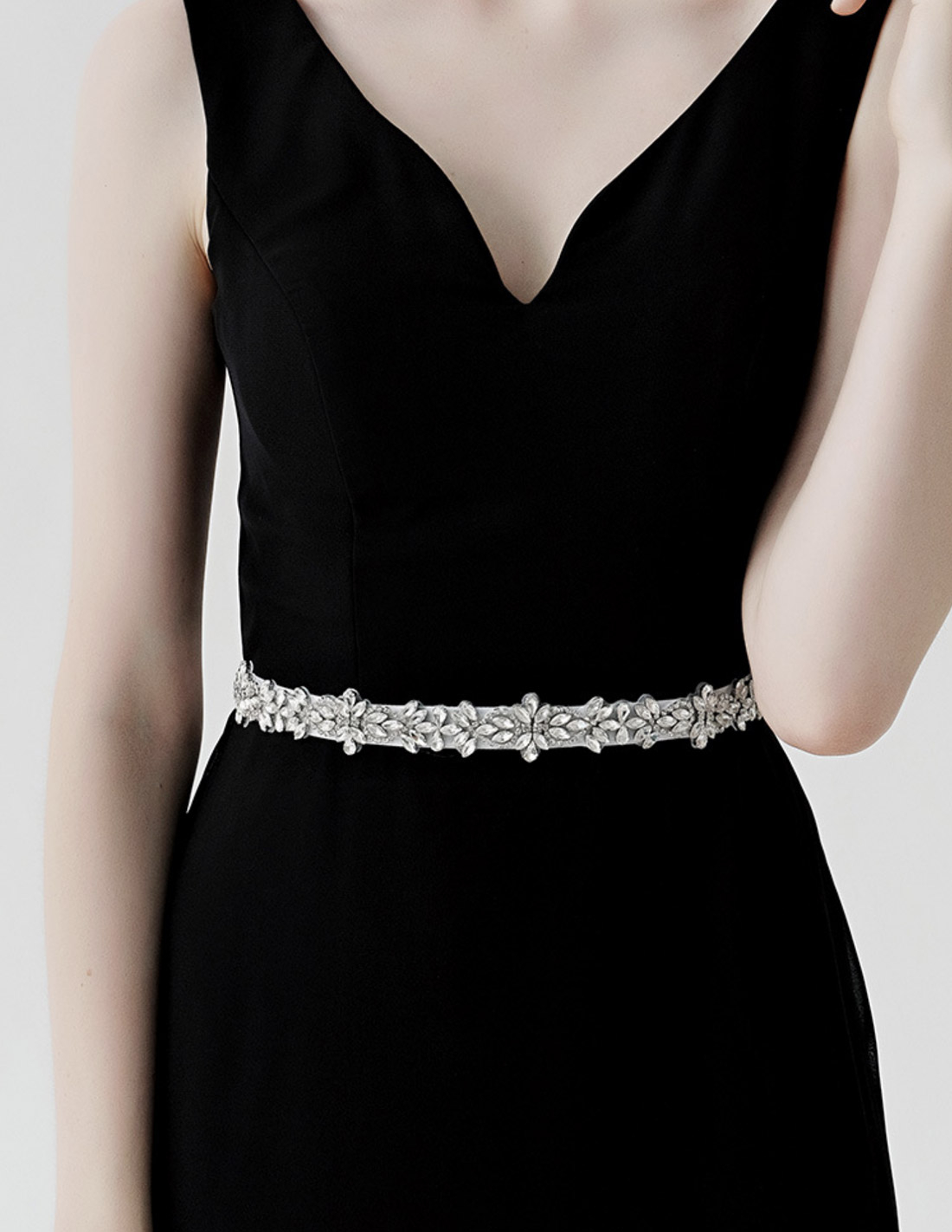 ビジューとラインストーンで作られたお花のモチーフが特徴的なサッシュベルトです。大ぶりのビジューではないのでシンプルなドレスに合うデザインとなっております。サテンのプリンセスラインのドレスや、Aラインのドレスに合わせてみてはいかがでしょうか。尚、サテンベルトの色変更をご希望のお客様はいつでもご相談ください。