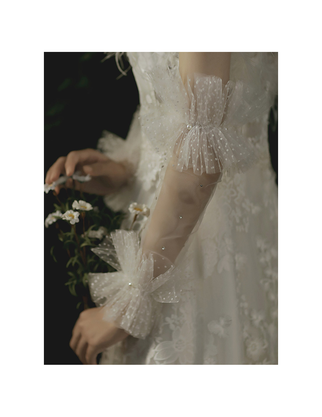 ドットチュールで出来たフリルが特徴的な、取り外し可能スリーブ、ブライダル用グローブです。こちらの商品は2WAYとなっており、取り外し可能のドレスに合わせるスリーブとして、またはウェディンググローブとしてもご利用いただけます。シンプルなソフトチュールにキラキラ光ビジューを散りばめた可愛らしいデザインはスリーブレスのドレスやデコルテとのドレスとも相性が抜群です。