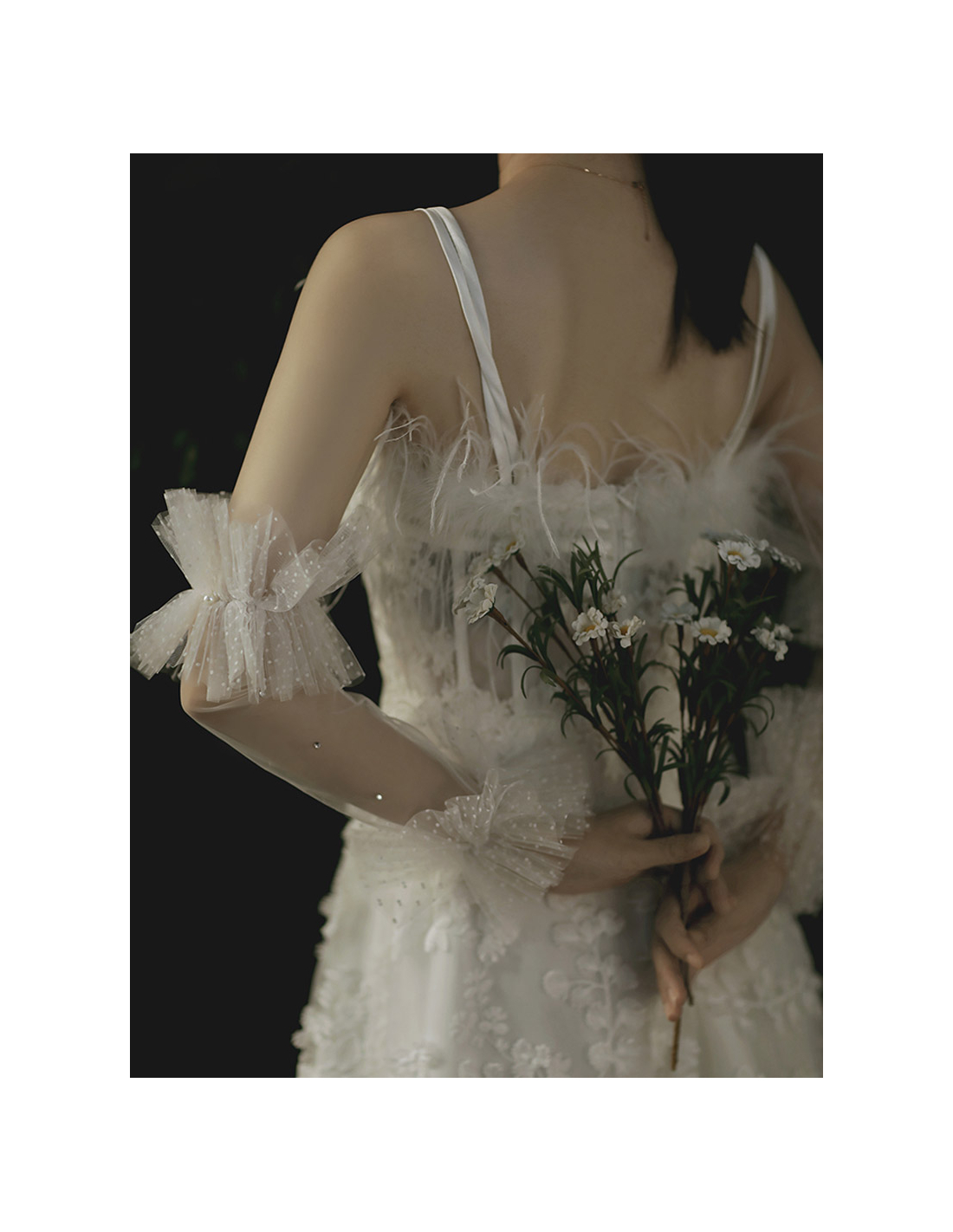 ウェディングドレス用の取り外し可能なスリーブでございます。水玉模様のチュールが大変可愛らしく、ドレスを2wayに変えてくれる魔法のスリーブです。スリーブのソフトチュール部分にはクリスタルがついており、輝きを放つデザインとなっております。水玉のチュール部分にゴムがついておりますので、大変簡単に脱ぎ着が出来ます。