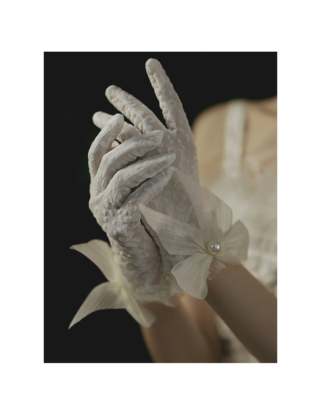 水玉のような不規則に広がるエレガントなレースで出来た結婚式用グローブでございます。シャンパン色の大きめなチュールリボンもあり、可愛らしいグローブとなっております。パールのイヤリングやネックレスにも合うように、チュールリボンにも大ぶりのパールが付いております。