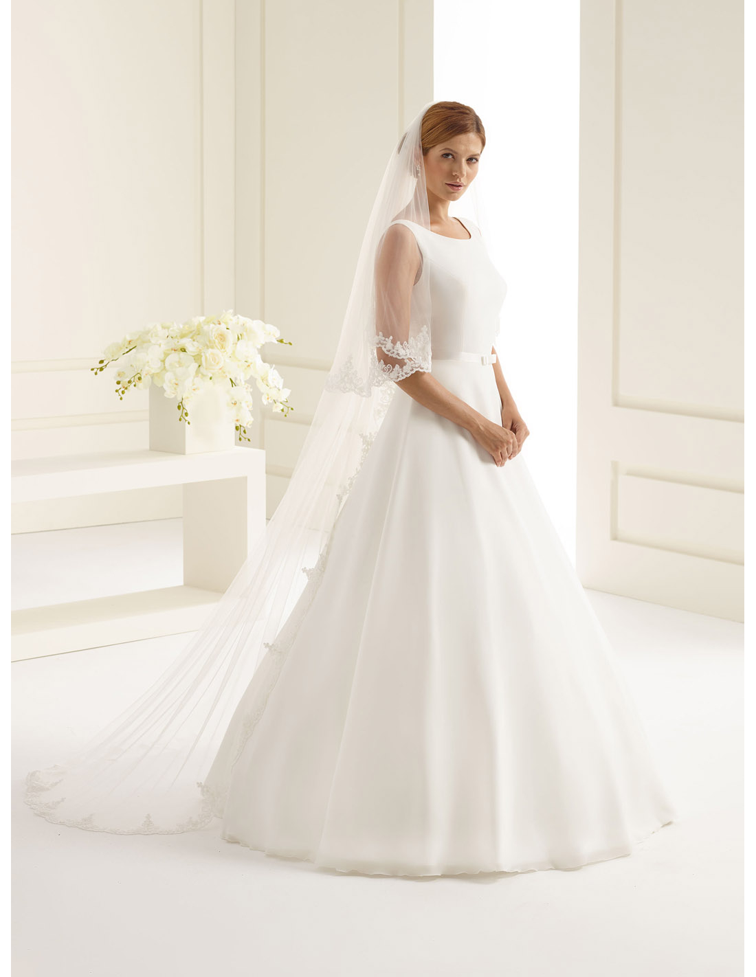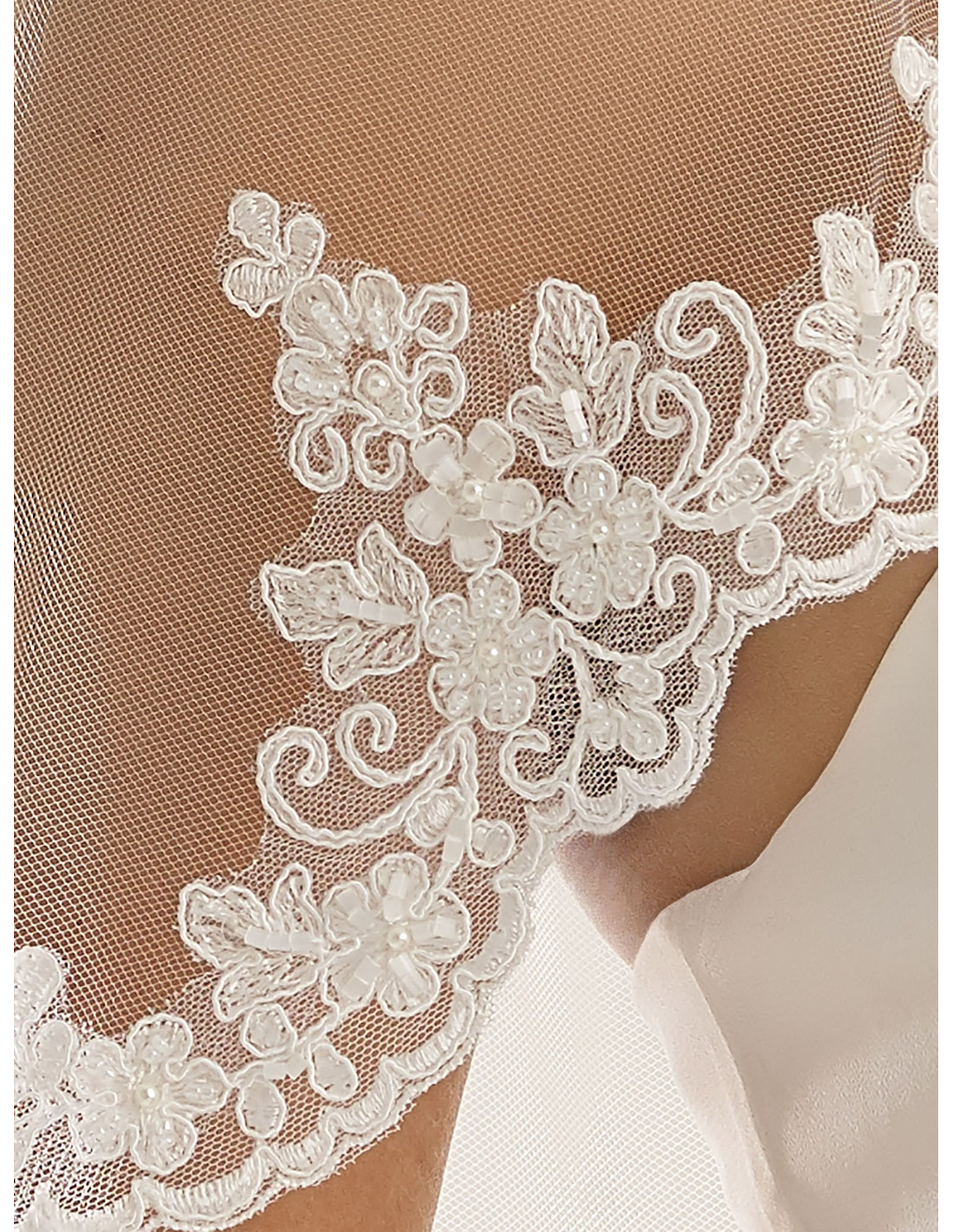 立体的なレブロデレースを使用したロングベールです。幅は1.5メートルですが、カスタマイズで3メートルの幅にすることも可能です。レブロデレースの上には同色のビーズ刺繍もあり、豪華なレースとなっております。1段目は85センチ程ございますので、顔を隠すと胸の辺りまでくる長さとなっております。肩も隠れますので、デコルテが見えるドレスでもこちらのベールがあれば問題ございません。